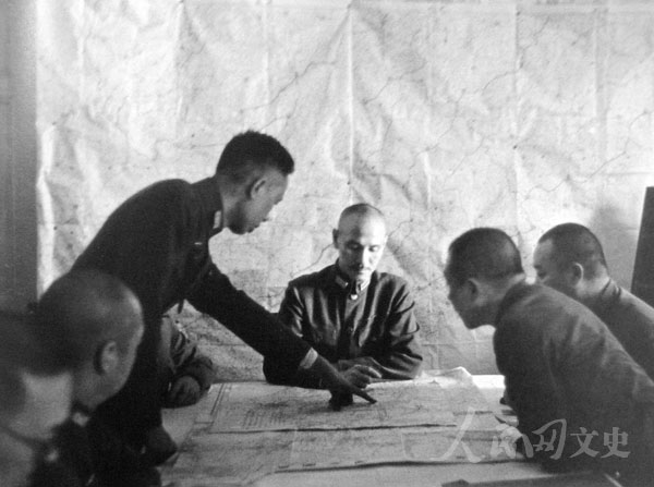 1938年7月4日,中国汉口。蒋介石(中坐者)主持军事会议。