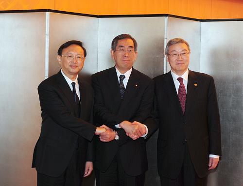 3月19日,在日本[RiBen]京都[JingDu],中国外交部长杨洁篪(左)、日本[RiBen]外相松本刚明(中)和韩国外交通商部长官金星焕举行[JuXing]会谈前握手。当日,中日韩三国外长会议[HuiYi]在日本[RiBen]京都[JingDu]举行[JuXing]。新华社[XinHuaShe]记者[JiZhe] 季春鹏 摄