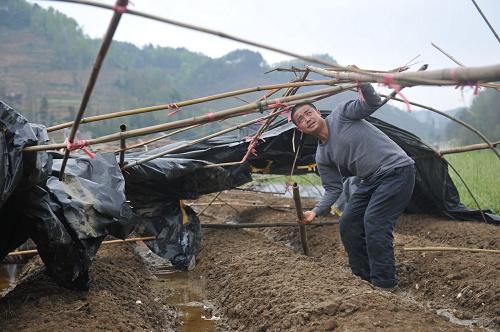 4月17日,贵州[GuiZhou]冰雹[BingBao]重灾区[ZhongZaiQu]长顺县营盘[YingPan]乡,一位村民[CunMin]在修复垮塌的大棚。新华社[XinHuaShe]记者[JiZhe] 欧东衢 摄