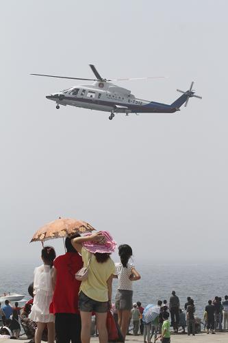 7月9日,人们在大连星海湾观看直升机海上搜救演练。新华社发(王华 摄)