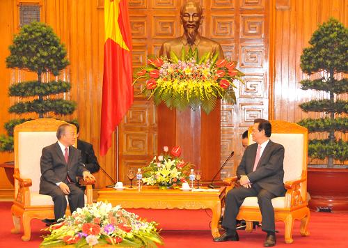 9月7日,越南总理阮晋勇(前右)在河内会见到访的中国国务委员戴秉国(前左)。新华社记者 李勍 摄