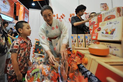 9月9日,来自日本神户的网商在展区向小朋友推介在日本设计、中国生产的儿童玩具。当日,2011网商节在浙江杭州和平国际会展中心开幕。这届为期三天的展会面积达34000平方米,共设展位1500个,涵盖消费电子、服装鞋帽、文体用品、母婴用品、家居家饰、工艺品礼品、汽车用品等。新华社记者 黄宗治 摄