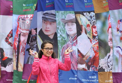 9月9日,在比利时首都布鲁塞尔的欧洲议会大厦前,一名欧洲女青年在展现中国年轻人风貌的彩旗前留影。新华社记者 武巍 摄