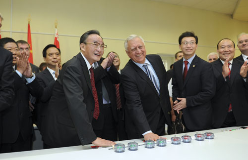 9月19日,正在白俄罗斯进行正式友好访问的中国全国人大常委会委员长吴邦国与白俄罗斯总理米亚斯尼科维奇共同出席中方承建的明斯克2号热电站正式启用仪式。新华社记者谢环驰摄