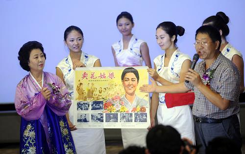 7月16日,朝鲜著名电影表演艺术家、电影《卖花姑娘》主演洪英姬与一位中国影迷珍藏30多年的《卖花姑娘》电影海报合影。当日,中朝首部合拍电影《平壤之约》首映式在北京举行。这是中国和朝鲜首部合拍电影、也是朝鲜第一部和外国合拍的影片,将于8月3日起在中国上映。新华社记者 金良快 摄