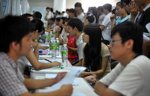 8月2日,一名求职者在人才招聘会上填写求职申请。新华社记者郭程摄