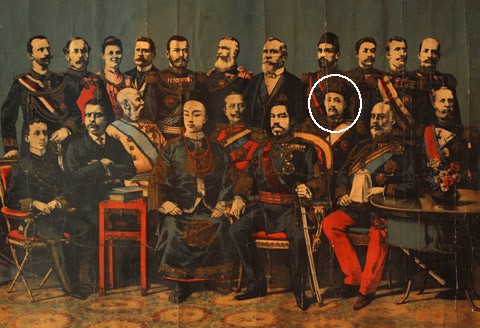 画报后排左起顺时针方向依次为:意大利、丹麦、荷兰、墨西哥、俄罗斯、比利时、法国、土耳其、泰国、葡萄牙、希腊、瑞典和挪威(被处理为单一国家)、英国、大韩[DaHan]帝国[DiGuo]、日本[RiBen]、德国、中国、奥地利、美国、西班牙国王(皇帝[HuangDi])