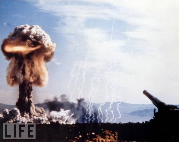 核试验(upshot-knothole)采用榴弹炮发射的方法,将装有核弹头的炮弹发射到远处,并且在空中爆炸。图中这枚搭载有核弹头的炮弹行进了超过6英里的距离,最终在距离地面500英尺的空中爆炸。