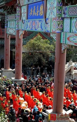 3月26日,巡游[XunYou]队伍[DuiWu]在开封[KaiFeng]宋都御街行进表演[BiaoYan]。 新华社[XinHuaShe]记者[JiZhe] 朱祥 摄