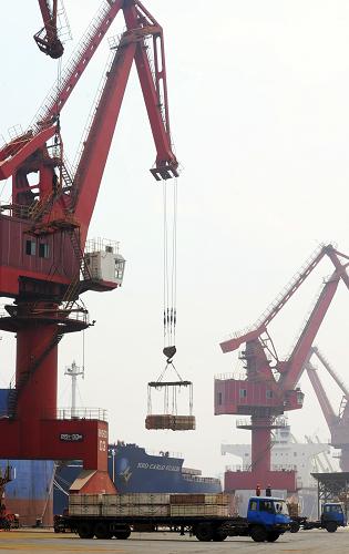 6月2日,江苏[JiangSu]连云港[LianYunGang]港集装箱码头[MaTou]接卸到港集装箱。新华社[XinHuaShe]发(王健民 摄)