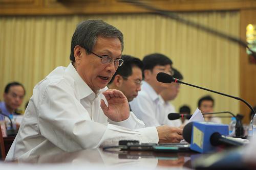 7月5日,国家海洋局海洋环境保护司司长李晓明(前排左三)在介绍情况。新华社记者邢广利 摄