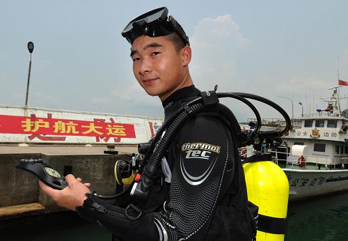 7月9日,深圳公安边防支队海上特勤队一名队员结束训练刚刚出水。当日,担负着大运会海上安保重要任务的深圳公安边防支队海上特勤队顶着高温和烈日进行海上摸排训练,备战大运安保。新华社记者 刘大伟 摄
