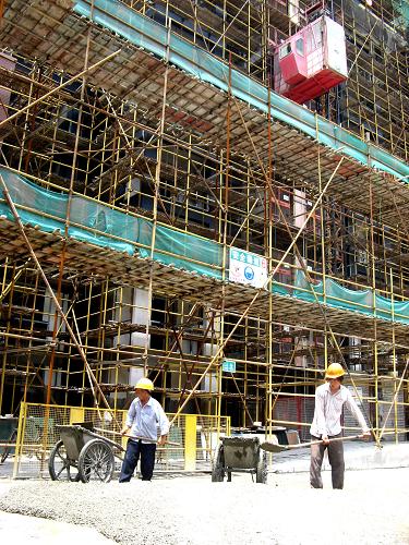 施工人员在上海宝山顾村保障房建设工地作业(7月3日摄)。新华社发(严大明 摄)