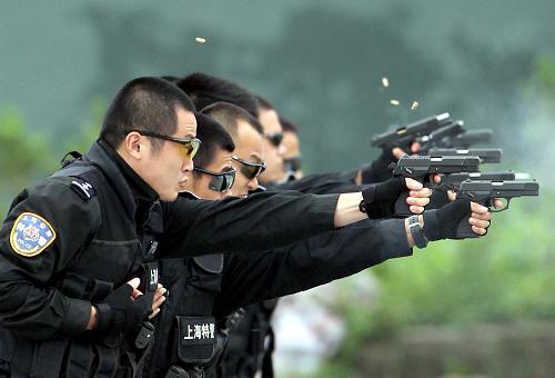 9月14日,特警队员正在进行左手射击训练。当日,上海市公安局特警总队举行大型反恐防暴综合演练,在一个小时的演练中,特警队员们展示了挑战极限、精度射击、空中打击、围捕恐怖分子等一系列战术和反恐技能实兵演练,在锻炼特警快速处置突发事件能力的同时,全面检验了上海公安特警正规化建设成果和特警“尖刀队”的攻坚能力。这也是上海特警近年最大规模的一次技能和装备展示。新华社记者 凡军 摄
