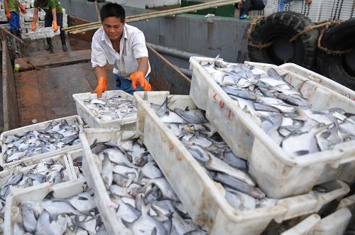 9月18日,在浙江台州市水产品交易市场码头,渔民在卸鱼货。新华社发(郏策 摄)