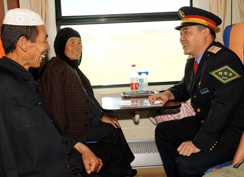 6年来,北京铁路客运段京藏车队所值乘的列车,从未发生一起涉及安全和服务的旅客投诉事件。京藏车队15个班组、500多名乘务人员以挑战极限、勇创一流的工作标准为广大旅客服务,先后推出了汉、藏、英3种语言服务,10多种藏、回菜肴,以及介绍高原风光等方面的13项优质服务,被中外旅客称为青藏高原最美丽的“天路彩虹”。新华社记者 唐召明 摄