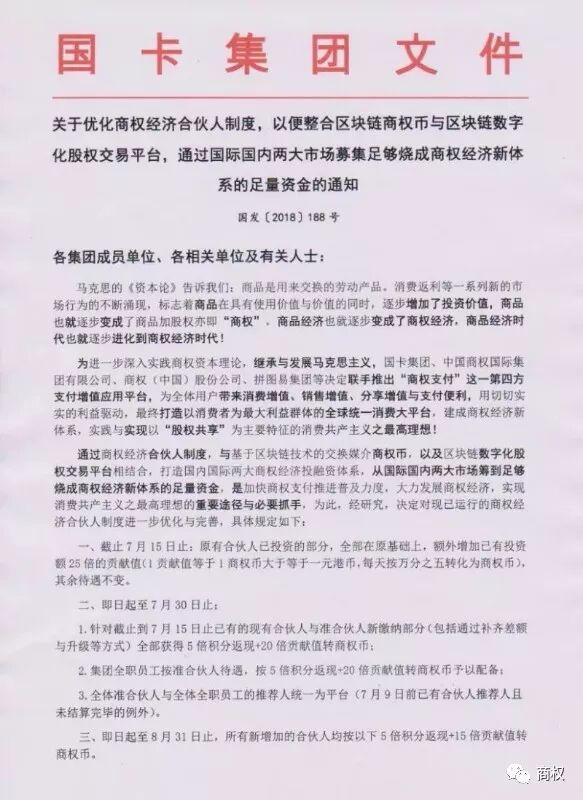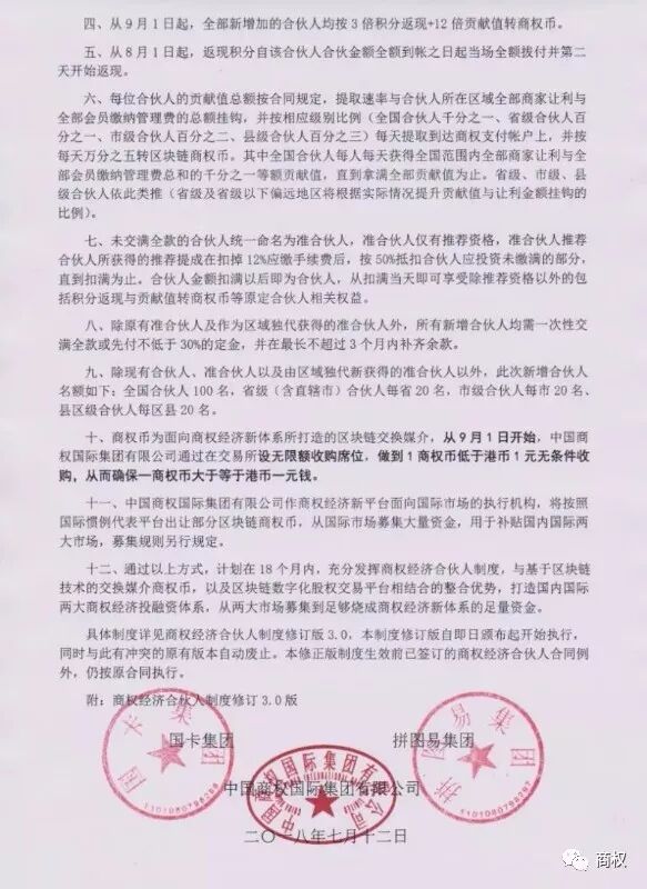 11.中国商权国际集团有限公司作商权经济新平台面向国际市场的执行机构,将按照国际惯例代表平台出让部分区块链商权币,从国际市场募集大量资金,用于补贴国内国际两大市场,募集规则另行规定。