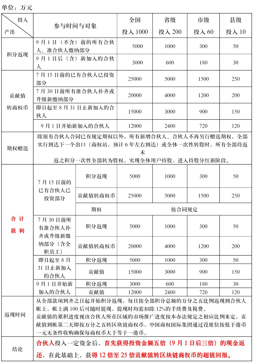 投资返现是指作为合伙人前期投入所获得的收入即投资收入,分为积分返现与贡献值转商权币。以7月15日前加入的全国合伙人为例,投入1000万,可获得5000万积分返现,外加2.5亿贡献值转区块链商权币(一贡献值等于一商权币,一商权币大于等于港币一元)。