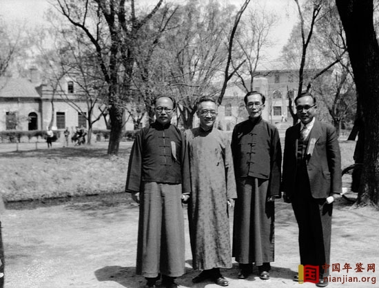 清华大学36周年校庆。这是原西南联大(北京[BeiJing]、清华、南开)三校恢复后,清华从昆明回北平清华园第一次举办校庆。左一为原西南联大训导长、昆明师范学院院长查良钊,左二为北京[BeiJing]大学校长胡适,左三为原西南联大校务委员会主席、清华大学校长梅贻琦,左四为南开大学秘书长黄钰生。北平,1947年4月27日。